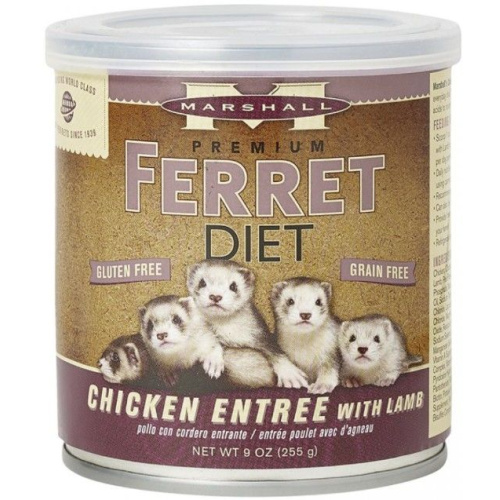 Marshalls Chicken Entree with Lamb is a great way to enhance the flavor of your ferrets everyday diet! This gluten-free and grain-free formula is an excellent source of Omega 3 & 6 to nourish skin and coat and is a perfect topper for all Marshall Ferret Diets. Features an easy to open pop-top and resealable plastic cap to keep canned diet topper fresh.