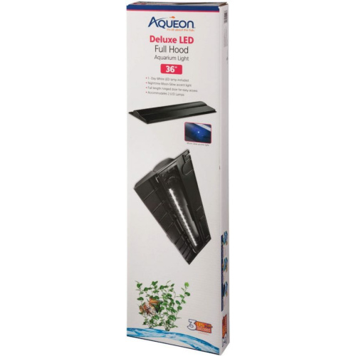 Aqueon Deluxe LED Full HoodThe Aqueon Deluxe LED Full Aquarium Hood provides brilliant, efficient, beautiful illumination for your aquarium in an easy-to-use, adaptable LED light fixture. One long Day White LED Lamp provides crisp brightness, while a Moon Glow Accent Light adds extra character and serenity to your underwater environment.