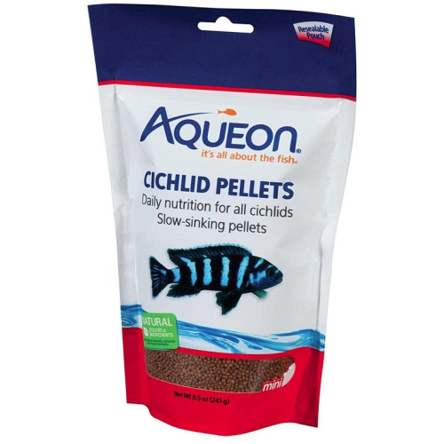 Aqueon Mini Cichlid Food PelletsAqeon Mini Cichlid Food Pellets are made with premium ingredients, like shrimp meal, to attract the most finicky cichlids. Available in a variety of pellet sizes for small to large cichlids as well as oscars and discus. The color enhancing formula is a blend of marigold, chili powder, and astaxanthin to help promote brilliant colors in fish.