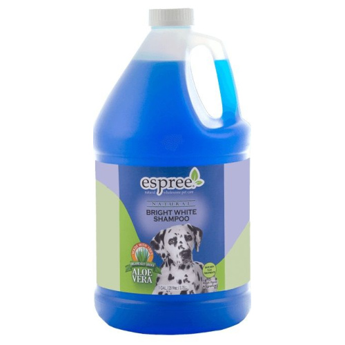 Espree Natural Bright White Shampoo restores brilliance to white and light colored coats, using natural optical brighteners and other ingredients to remove stains and discolorations. This brightening dog shampoo is made with 100% organically grown Aloe Vera and safe to use with flea treatments.