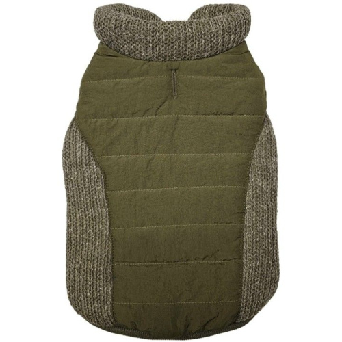 Fashion Pet Sweater Trim Puffy Dog Coat Olive. Sweater trimmed puffer coat that is reversible! 2 great looks in 1. High knit collar for added warmth. Warm cozy fleece on reverse side. Leash hole.