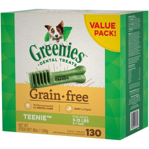 Greenies Grain Free Teenie Dental Dog TreatOne Greenies Grain-Free Dental Treat is all it takes for clean teeth, fresh breath, and a happy dog. Featuring potatoes, plus a delightfully chewy texture that fights plaque and tartar, your dog can't wait to sink their teeth into these grain-free dog treats.