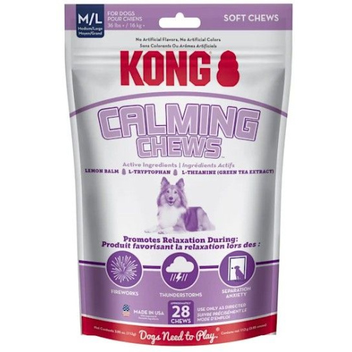 KONG Calming Chews supplements help alleviate stress and restlessness while promoting relaxation. The soft, highly appetizing chews contain naturally-sourced lemon balm, tryptophan, and green tea extract that combine to support feelings of calm. Ideal for use during fireworks, thunderstorms, and moments of separation anxiety this supplement also contains no artificial colors or flavors.